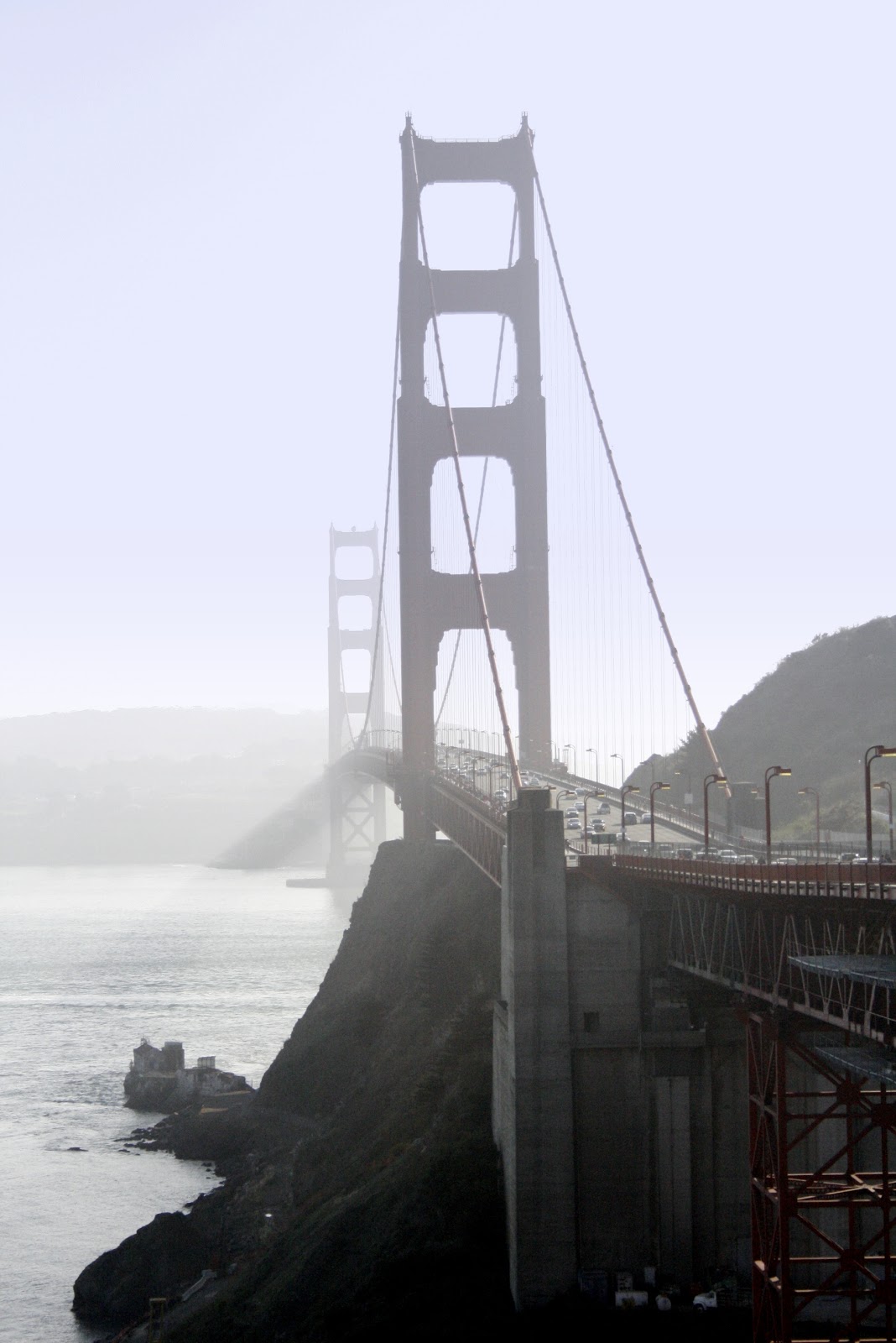and Presidio. There are a number of decaying military fortifications and empty soldier's quarters from the past. Ancient grooves in the rust and chocolate coloured cliffs looked like the rhythmic lines on a topographic map. The sun was heading closer to the Pacific so that the light conditions created a glow on the huge Norfolk and Sitca pine trees. A group of small deer, quite common all around the west coast, nibbled grass and watched with caution as I approached with my camera. The waves of San Francisco Bay crashed on the rocks below where a group of white seals casually lay about. Most spectacular was the full view of the Golden Gate Bridge spanning the harbour with its iconic strength.