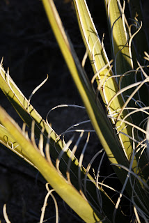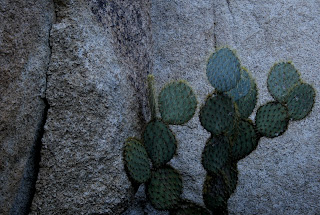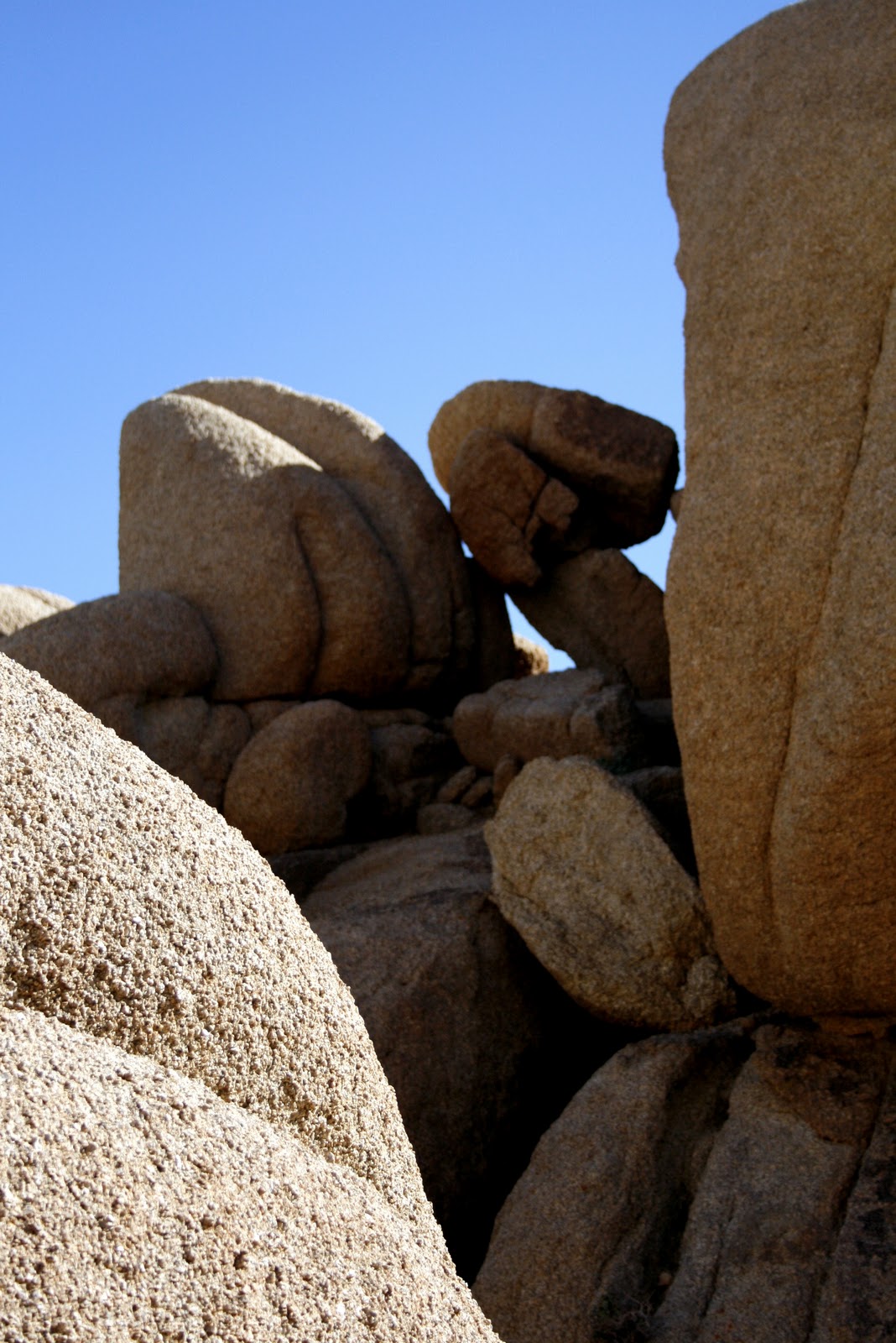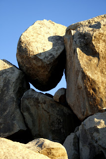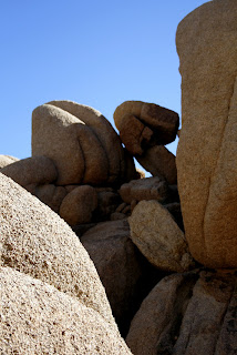 Our campground was dusty and hot. A golf course ran along behind it with grass dry enough to burst into flame any minute. The "greens" were spray painted on! We filled our canteens and headed into Joshua Tree National Park. There were many similarities to Death Valley but with more abundance of grasses and trees. As Chris noted in Death Valley, many miles of rocky fields and boulder-mountains looked like they'd been constructed by a couple of giants in competition using over sized steam shovels and bulldozers. Similar expanses could be seen in Joshua Park. The rocks in many places are much larger and rounded. They are blond coloured and textured like rough grade sandpaper. Many sit atop one another reminiscent of "cartoon" Coyote waiting, ready to push the boulder onto the unsuspecting roadrunner below. Remarkably, cactus, juniper and mesquite are able to sprout and grow in the cracks of these monstrous rocks against all odds. Quail, about the size of our blue jays are a common sight rolling along the sand or flying with their odd headdress-feathers bobbing.