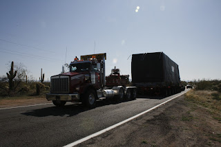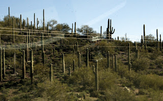 It would be cool to see a live family of these! Many hillsides were loaded with Saguaro cactus that looked like forest-fire remnants in Canada, bare hills and hundreds of "poles". We also had a break at the side of the road to wait for an "OVERSIZE LOAD" to pass by, that occupied both lanes. We passed many small towns and villages comprised of shacks and pueblo designed homes, some with a school or gas station; most with dusty yards and grand collections of old rusted trucks and junk.