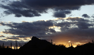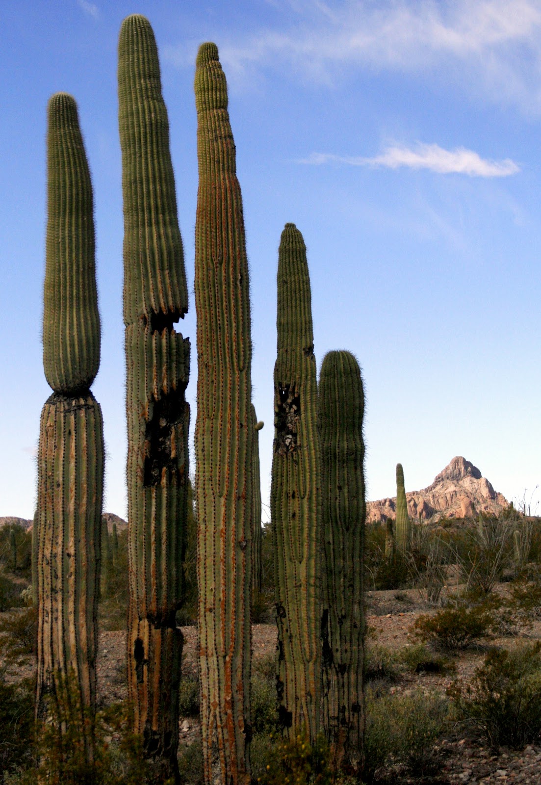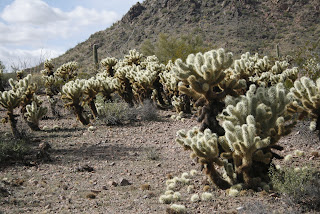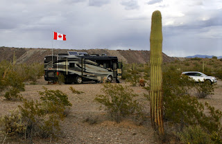 The most isolated camping spot we've stayed at was in BLM land just outside of Ajo. We spent eight days there taking daily hikes, visiting the sights of the mining town of Ajo, reading and relaxing. Our nearest neighbours were at least a mile away. The solitude was magnificent. There are a large number of Saguaro cactus here, each unique with personalities like people, some tall and proud, others outgoing with many arms flailing, a few shy babies growing up,as they do, in the shelter of trees and bushes and others with top notches, or those with 5 or 6 rounds sprouts, like small hedgehogs, ready to grow into huge arms one day. The wear and tear on some of those monumental plants is amazing, large gashes, woodpecker holes and shrivelled skin due to lack of moisture or disease. Those beauties don't even grow arms until they are a minimum fifty years old! There were patches of teddy bear cactus so crammed with lethal needles on their boughs and in the piles on the ground below, we were calling them mine fields. Dixie got a few stuck in her paws but luckily would stop immediately for us to pluck out the spines.