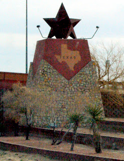 Pushed on east. The highway ran parallel to Mexico for awhile and we could see the sad jumble of colourful run-down shacks crowded on the hills. Entered Texas where everything has a star or a bull on it. Twas a long haul through the El Paso 'bypass' that crossed miles of sprawling metropolis. We made a lunch stop at the famous "La Posta de Mesilla", where top notch Mexican food has been served since 1939. The place was really "Olde Mexican-style" with amazing tile work, folk art wall paintings and live parrots caged in a huge ornate "prison" in the main lobby.