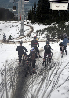 gear including helmets with built-in cameras and expensive bikes of all shapes and colours. As we embarked on our long cable car journey up Whistler Mountain, we could look down on the bikes swerving and speeding around the muddy trails, some starting their challenge in the fresh fallen snow at the top! Olympic rings and many Canadian flags remained as remnants of Vancouver's Olympic Fame. Google the Peak to Peak Gondola to get a sense of the magnificent journey we had high above the forest, ski trails, river and town of Whistler from Whistler Mountain to Blackcomb. Once there, everyone went a little snow crazy.