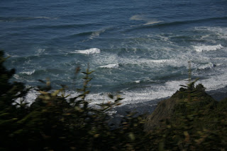 Our last Oregon morning was T-shirt weather, very warm and sunny. Driving south we enjoyed breathtaking coastal views and rain forests bathed in sunlight. An hour later we broke into California's grey-green mountains dotted with scruff bush and clumps of tall cream-tufted grasses. Twisted Cypress were back lit creating dramatic silhouettes. We passed areas where snow had fallen that morning but luckily melted from the highway surfaces. The dry, warm skies were replaced with haze and cooler temperatures by afternoon.