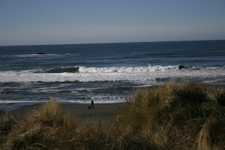 We set up CC facing a sheltered bay of the Pacific in Crescent City. We settled in our lawn chairs at the beach's edge. Comfort demanded a few layers of sweaters and scarves but allowed us a long repose to watch the clammers, digging and slowly filling their pails, myriad seabirds floating on the surf or gliding above it and Sunday-afternoon families strolling on the beach or fishing from the pier. A lighthouse flashed a warning light out to sea at thirty second intervals. We could hear the lonely tone of a bell calling out to ships with a long "Me" as in "Do, Re, Me" every ten seconds. The temperature dropped and the wind picked up as the sun descended. The sunset was Class A with oranges, pinks and purples laying down magenta streaks across the turquoise water.