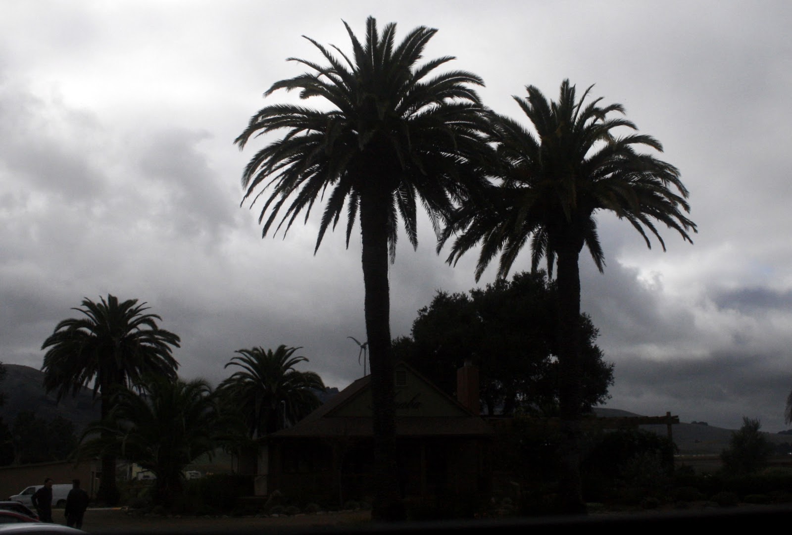 Vineyards were next. Napa Valley winery estates were gated with ornate iron, massive hedges of roses, flowering shrubs of fuchsia and orange and well tended palm trees. The vines' fall foliage rambled in yellows, deep oranges and wine-reds. Carpets of brilliant green grass between the rows contrasted starkly with the leaves. "Backstage" were rounded rolling highlands decked out in muted tones of fawn and sage.