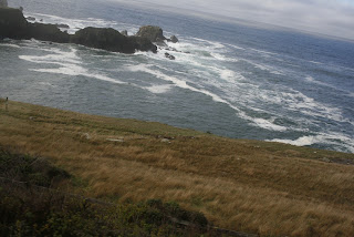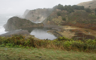 corners and the constant changes in elevation. With my clenched heart and knotted stomach, I'm not sure fun would be my adjective of choice. The scenery was spectacular and every view seemed more impressive as we rounded each bend. The Pacific's waves were easily 15-20' high and pitched up dazzling white spray when they crashed ashore or against the apartment sized rocks just off shore. Some cliffs blushed red and orange against the bold blue sky. We moved quickly from sun to haze and mist. Lacey, pale green moss hung from the branches of many Sitca Spruce as if they've been "tinselled" for Christmas. Strong winds have