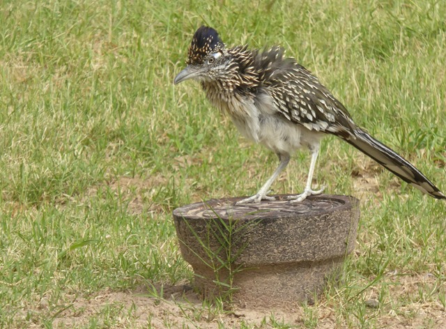 We had daily visitations from a pair of Roadrunners who nonchalantly walked through our campsite, pruned their feathers and caught and devoured insects. In the past, we have viewed Roadrunners only at a distance, usually on the move away from us or crossing the road just like their portrayal in the Coyote/Roadrunner cartoons. It was a real thrill to watch them up close beside our motorhome! We regularly watched a Raven and a group of Vultures, many small songbirds and a pair of Gila Woodpeckers who lived in a tree hole beside the RV. A couple of days, it was so hot and dry that the birds were “panting”. A troupe of Javelinas could be seen dining on the grass and searching for scrap food that humans had carelessly left around.